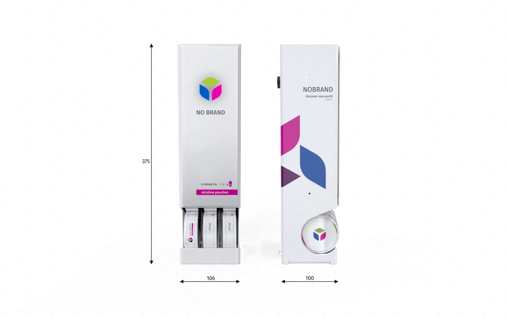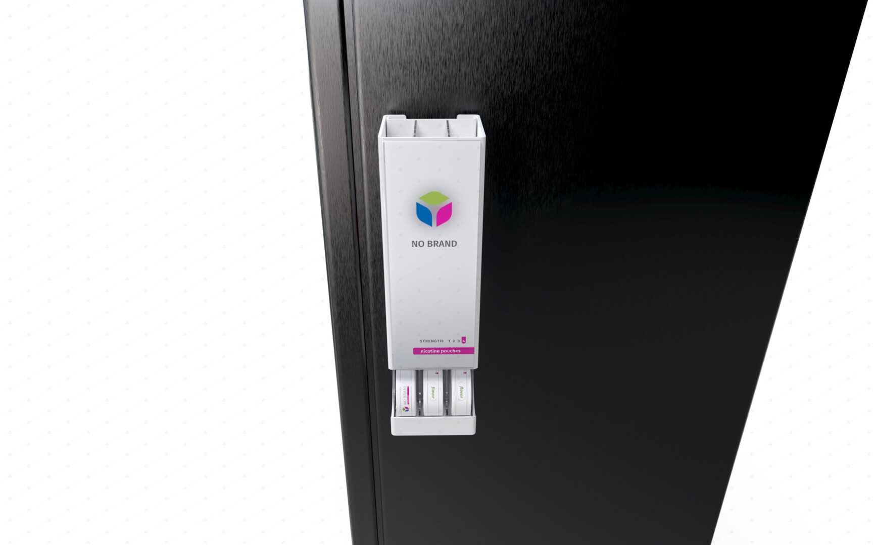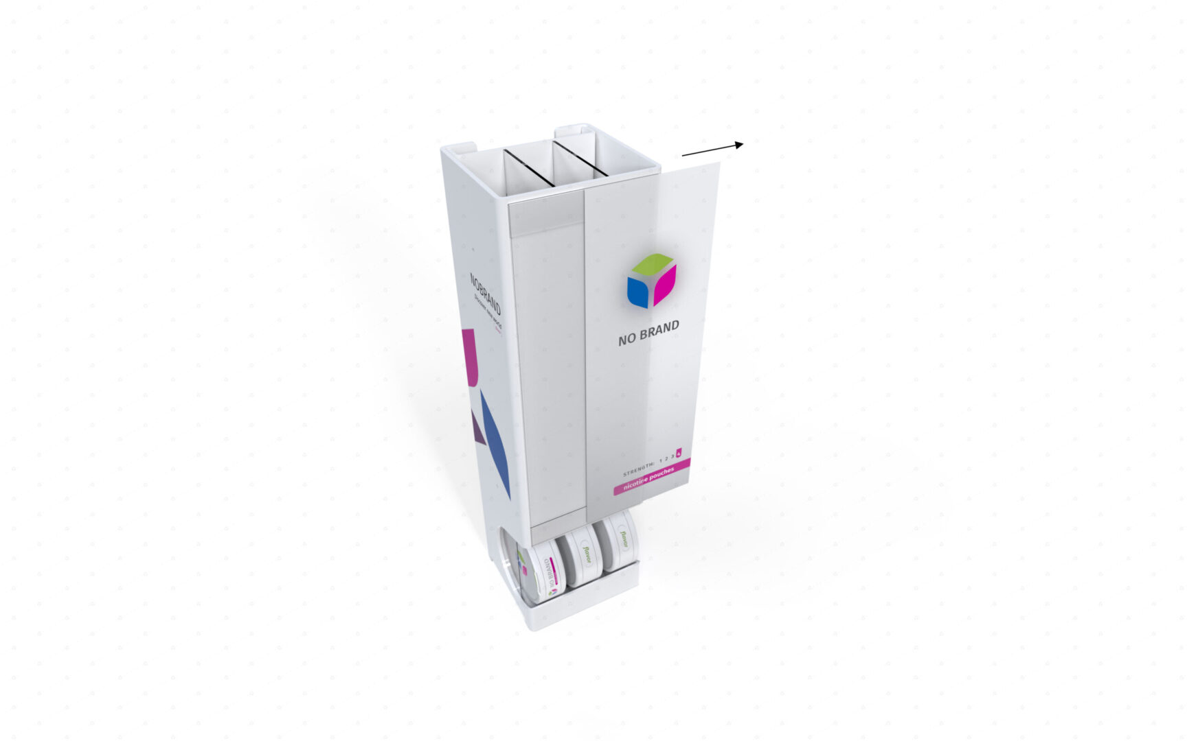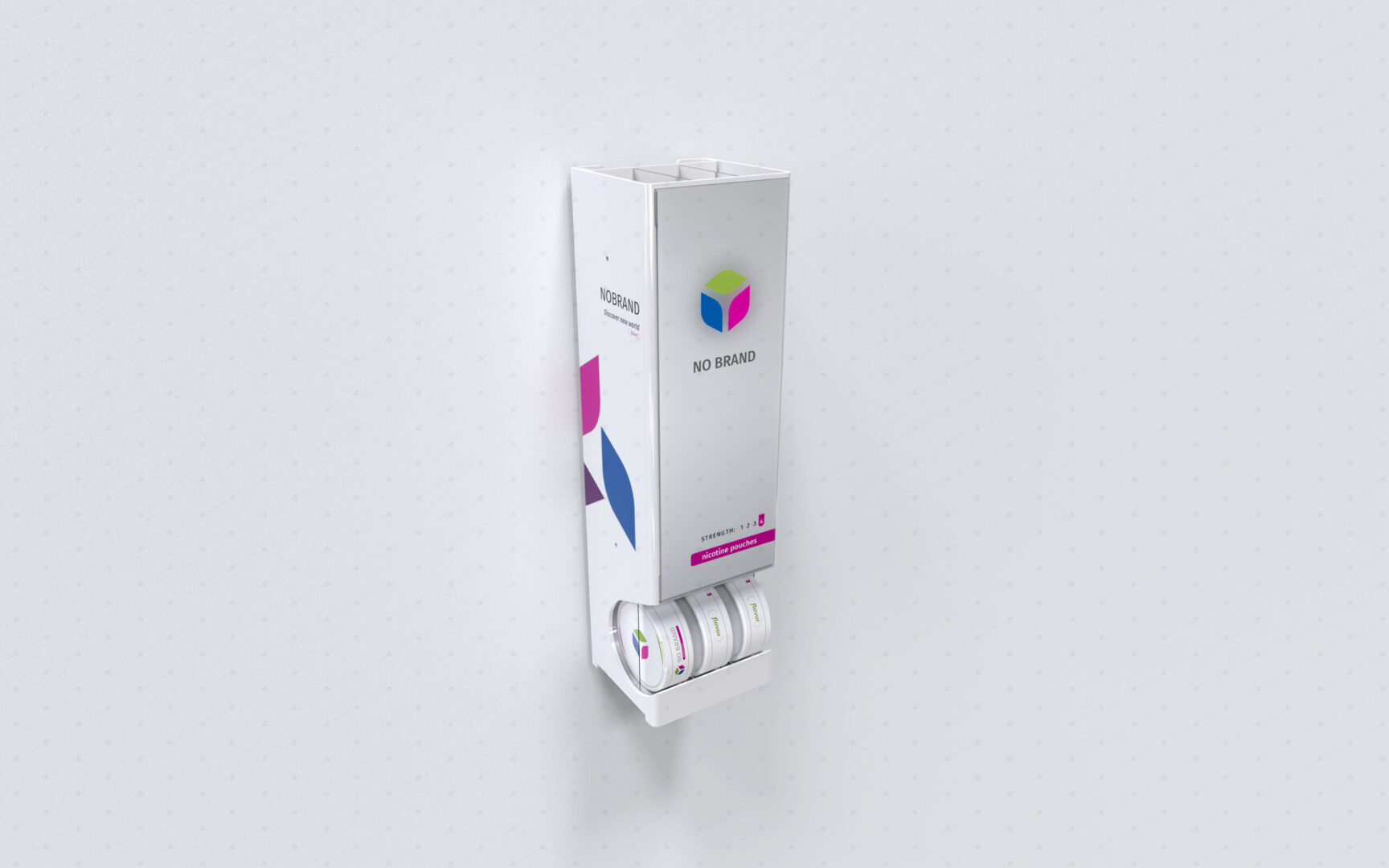 Dispenser vhodný do mimoriadne stiesnených priestorov. Má talent byť umiestnený kdekoľvek: je možné ho položiť ku kase, za kasu, nad kasu, na stenu a aj na akýkoľvek povrch. Vďaka otvorom na zadnej stene je možné ho zavesiť na háčiky či konzoly. Vďaka (na prianie dodávaným) magnetom je možné ho prichytiť na kovový podklad (napríklad stenu chladničky na prevádzke) a pri použití obojstrannej lepiacej pásky (tak isto na prianie) je možné ho nalepiť (ideálne na rovný hladký povrch) naozaj všade. Vaše dobré meno bude šíriť cez celoplošný branding, alebo (na prianie) cez plagáty z držiaku na prednej strane. Dispenser má kapacitu 3 facingov, pričom do každého vojde 5 balení. Celková kapacita tohto super kompaktného dispensera je 15 balení postaviteľných kdekoľvek. Dispenser dodávame štandardne v transparentnom, čiernom a bielom vyhotovení (na vizuáli v bielom vyhotovení s brandingom). Na požiadanie aj vo farebnom plaste. Rovnako vám vieme navrhnúť aj branding na mieru a dodať ho priamo s vloženým plagátom.