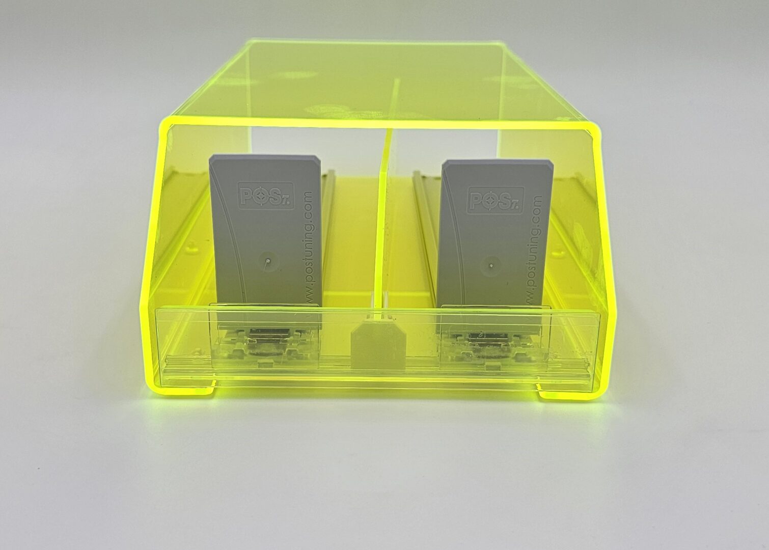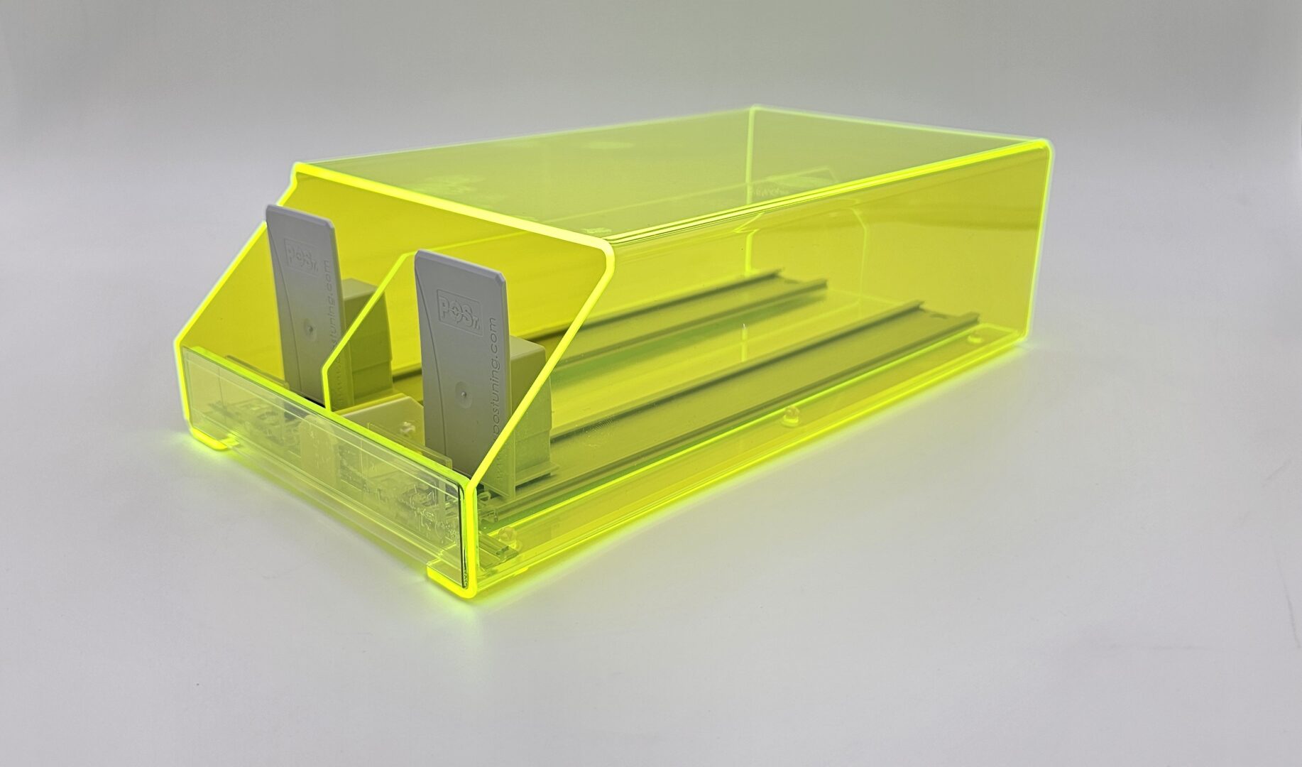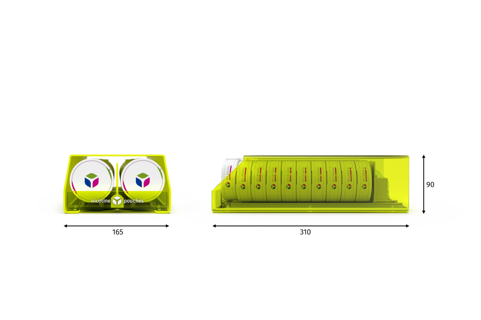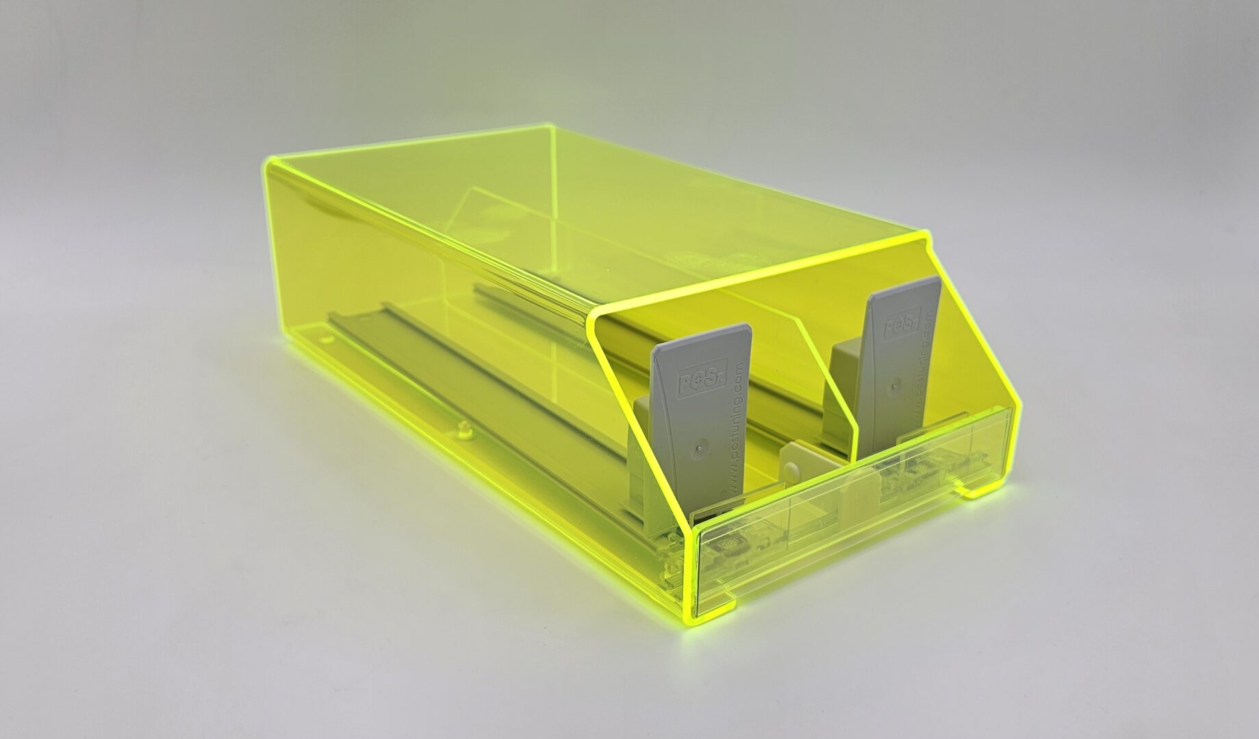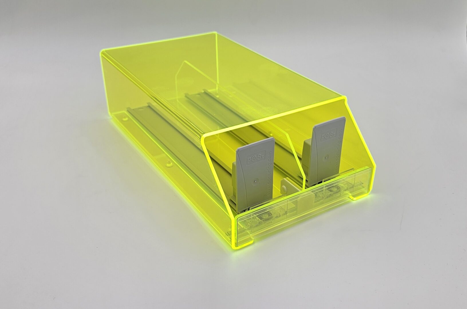 Z nášho portfólia ide o jeden zo základných modelov dispensera, pripraveného pre umiestnenie 2 facingov (teda 2 druhov tabakov). V tomto prípade ide o špeciálne vyhotovenie vytvorené z exkluzívneho materiálu FLO Perspex®, ktorý má Florescenčné - "svietiace" vlastnosti - teda pri pohľade na výrobok všetky jeho hrany "svietia". Tento špeciálny "svietiaci efekt" je neprehliadnuteľný na akejkoľvek prevádzke. Úžasnou výhodou je, že aj napriek tomuto svietiacemu efektu dispenser v skutočnosti nespotrebováva žiadnu elektrickú energiu a teda nepotrebuje elektrickú zásuvku pre svoje fungovanie. Materiál samotný je transparentný, takže tovar je viditeľný z každej strany. Dispenser 2x1 dodávame štandardne v transparentnom, čiernom a bielom vyhotovení. Na prianie v akejkoľvek dostupnej farbe plastu. Vieme vám naň vytvoriť a potlačiť branding, či dodať ho s cenovníkovou lištou pred produktami. A tak, ako všetky ostatné vám ho vieme prispôsobiť presne podľa vašich potrieb. Či už sa jedná o jeho kapacitu - od jedného po 20 balení v každom z dvoch facingov, presné rozmery ktoré potrebujete, materiál, branding či farbu samotného výrobku.