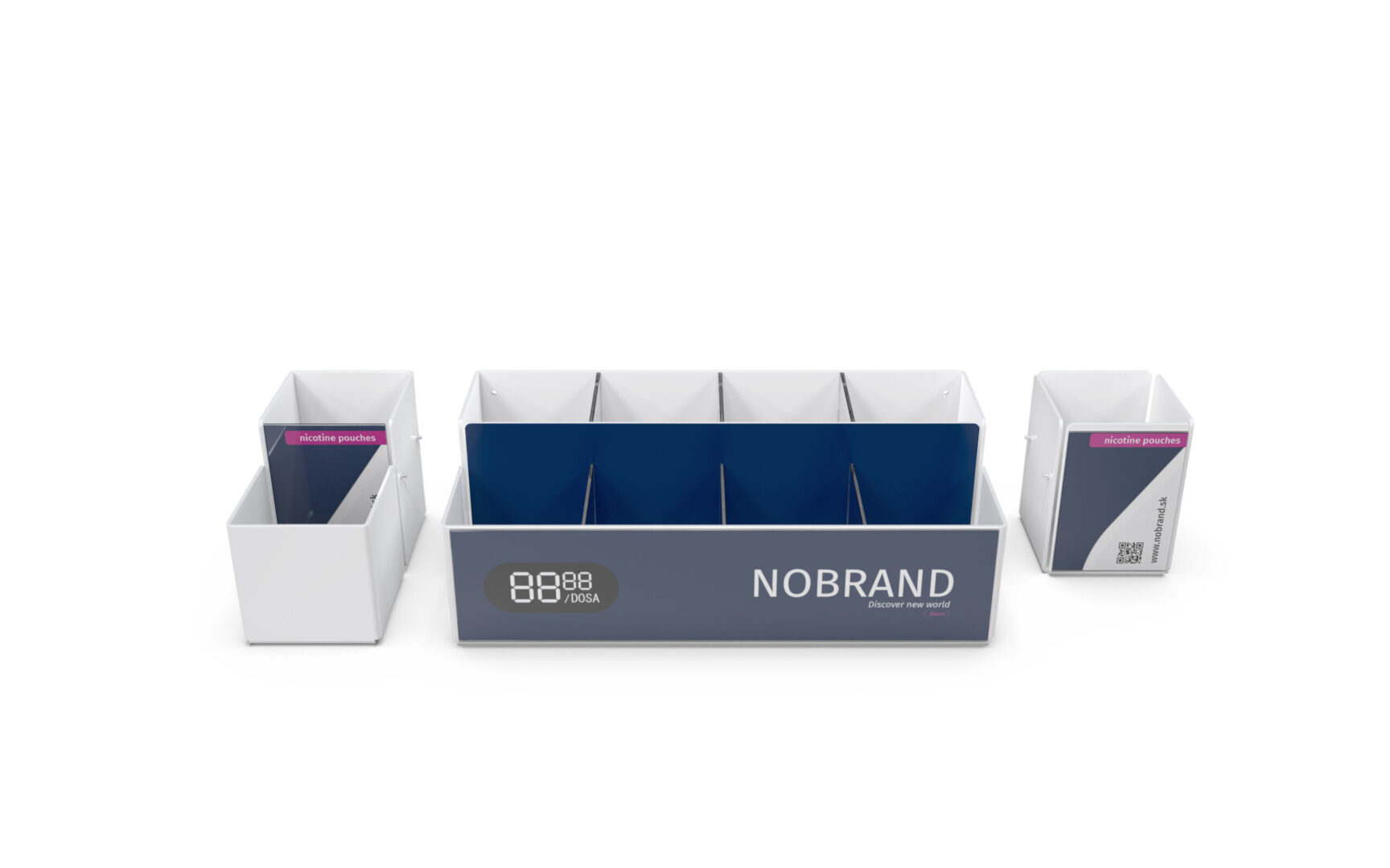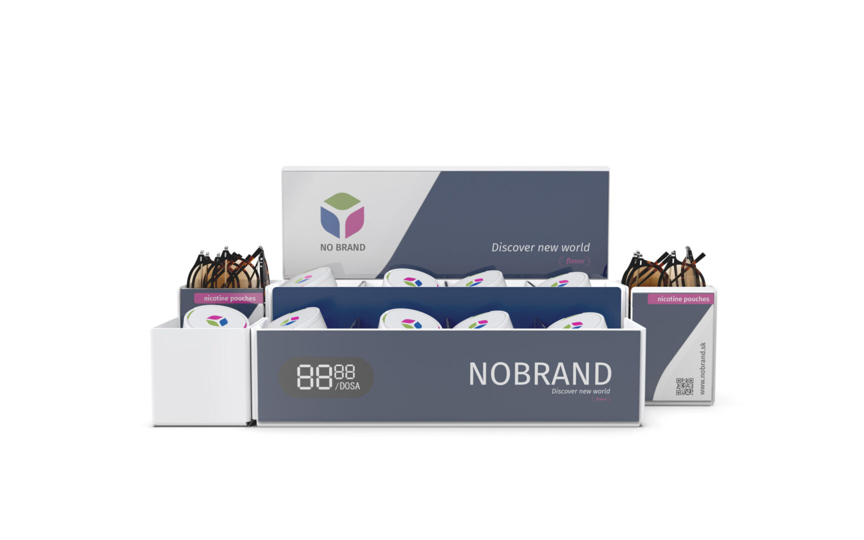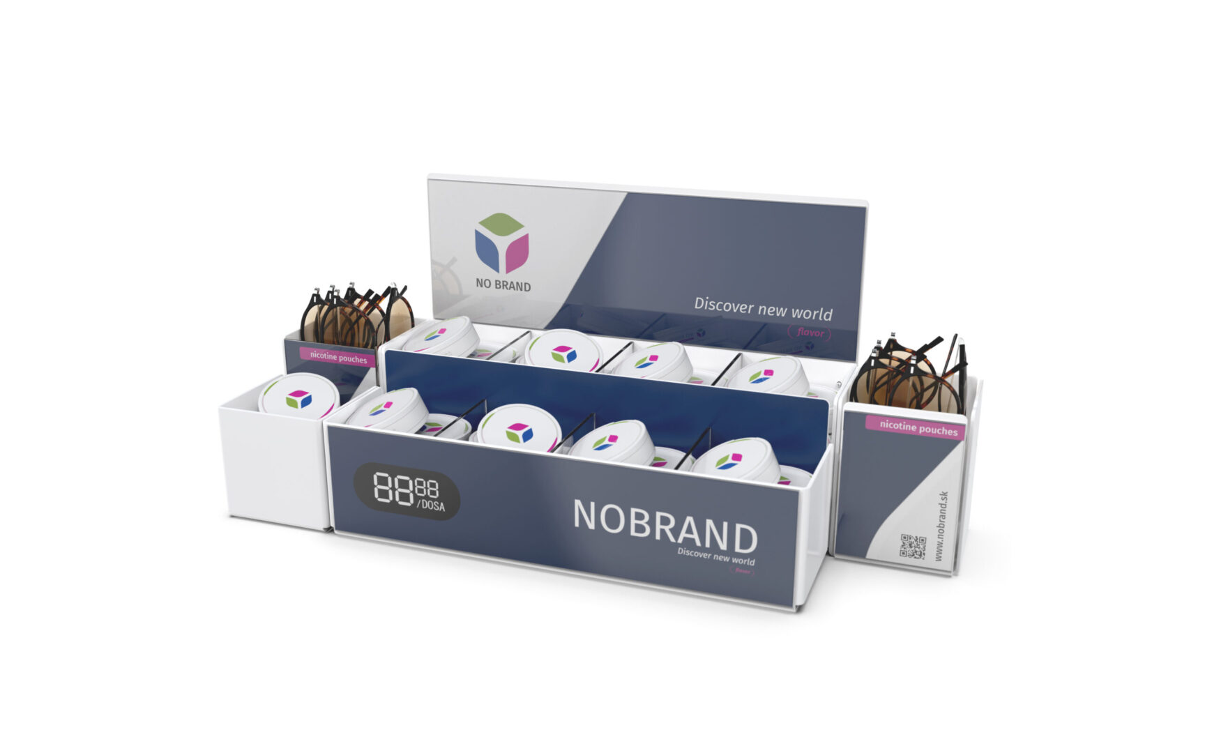 Celkom iný dispenser ako predošlé produkty, ktorý ponúka možnosť predaja viacerých typov produktov v rozličných veľkostiach. Produkty sú uložené voľne. Mimoriadne vhodný je na predaj SNUSu a promo darčekov (k nemu) súčasne. Branding je zabezpečený držiakmi plagátov na zadnej a prednej strane, možnosťami obrandovania všetkých strán polepom alebo priamou UV potlačou na plast. Jeho veľkou variabilnou výhodou je, že jednotlivé segmenty sú oddeliteľné bez použitia náradia a teda si ho viete na každej prevádzke poskladať presne ako potrebujete. Segmenty vieme dodávať aj samostatne podľa požadovaného množstva. Dispenser dodávame štandardne v transparentnom, čiernom a bielom vyhotovení. Na požiadanie aj vo farebnom plaste. Rovnako vám vieme navrhnúť aj celý branding, ktorým vám ho obrandujeme. Riešenie vieme dodať kompletne aj s plagátmi - po vybalení a naplnení produktami je pripravený na nasadenie.
