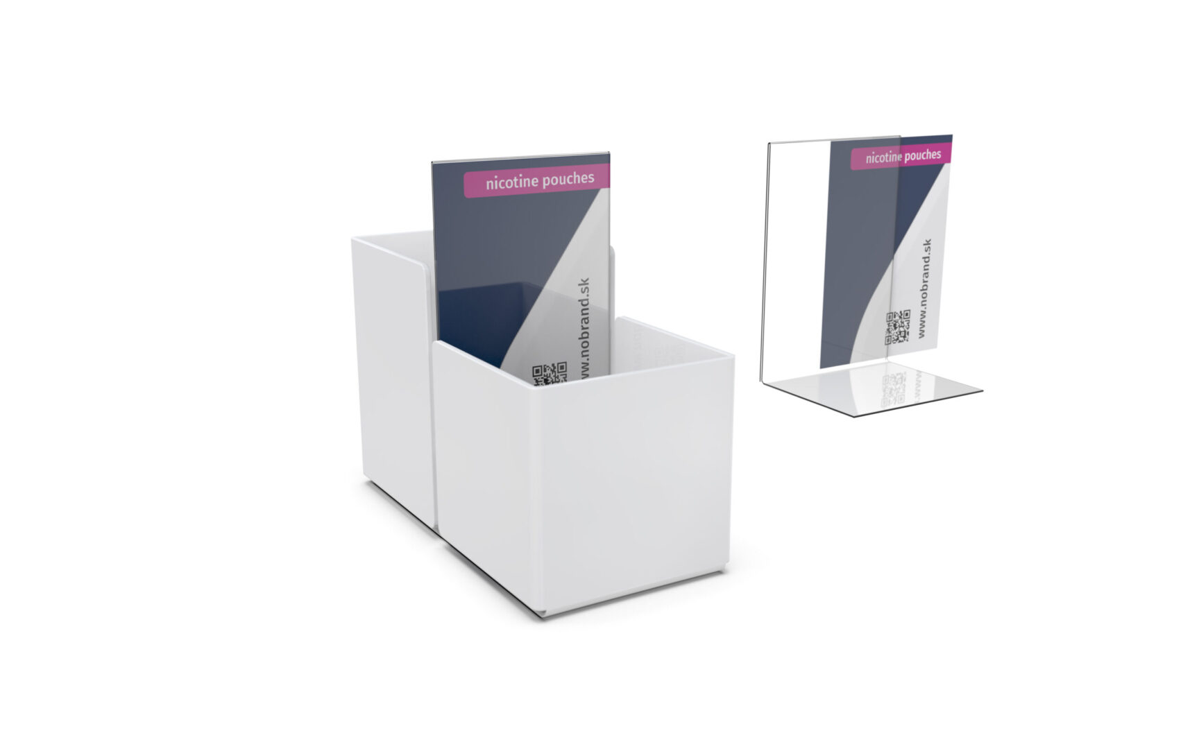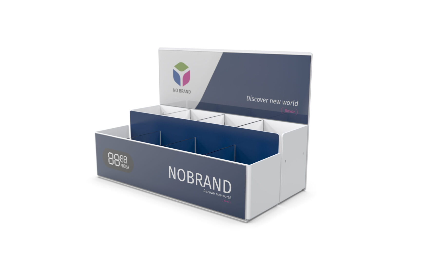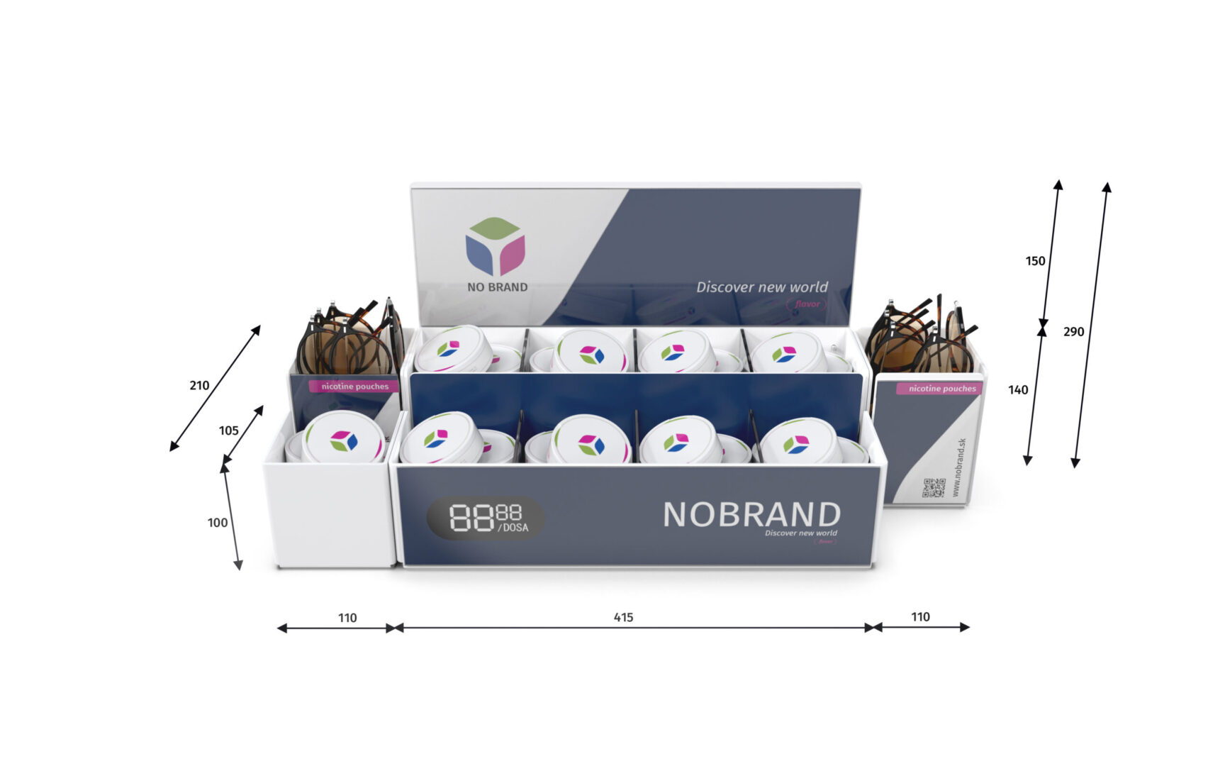 Celkom iný dispenser ako predošlé produkty, ktorý ponúka možnosť predaja viacerých typov produktov v rozličných veľkostiach. Produkty sú uložené voľne. Mimoriadne vhodný je na predaj SNUSu a promo darčekov (k nemu) súčasne. Branding je zabezpečený držiakmi plagátov na zadnej a prednej strane, možnosťami obrandovania všetkých strán polepom alebo priamou UV potlačou na plast. Jeho veľkou variabilnou výhodou je, že jednotlivé segmenty sú oddeliteľné bez použitia náradia a teda si ho viete na každej prevádzke poskladať presne ako potrebujete. Segmenty vieme dodávať aj samostatne podľa požadovaného množstva. Dispenser dodávame štandardne v transparentnom, čiernom a bielom vyhotovení. Na požiadanie aj vo farebnom plaste. Rovnako vám vieme navrhnúť aj celý branding, ktorým vám ho obrandujeme. Riešenie vieme dodať kompletne aj s plagátmi - po vybalení a naplnení produktami je pripravený na nasadenie.